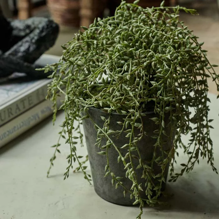 Incredible texture and cascading beaded tendrils, the Artificial Trailing Senecio In Pot is a great all rounder. Enlivening any surface, it looks super chic tumbling from a high shelf.