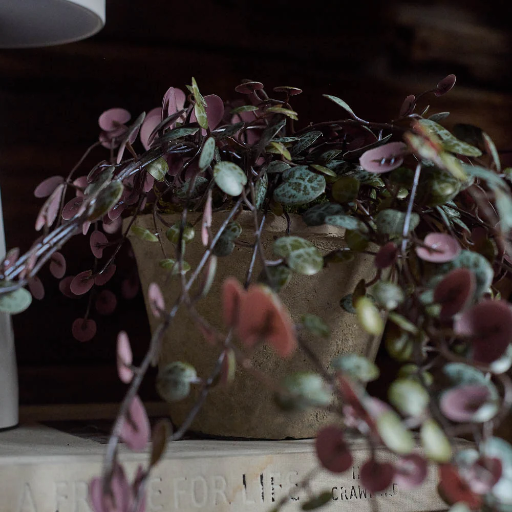 With its pink purple and green hues leaves the Artificial Trailing String Of Hearts adds texture and intrigue. The abundant trails look super cool tumbling from a kitchen unit or bathroom shelf.
