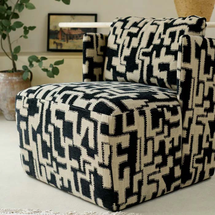 In a unique black and beige abstract pattern with a shape that exudes effortlessly laid back vibes, this patterned armchair is a showstopper.