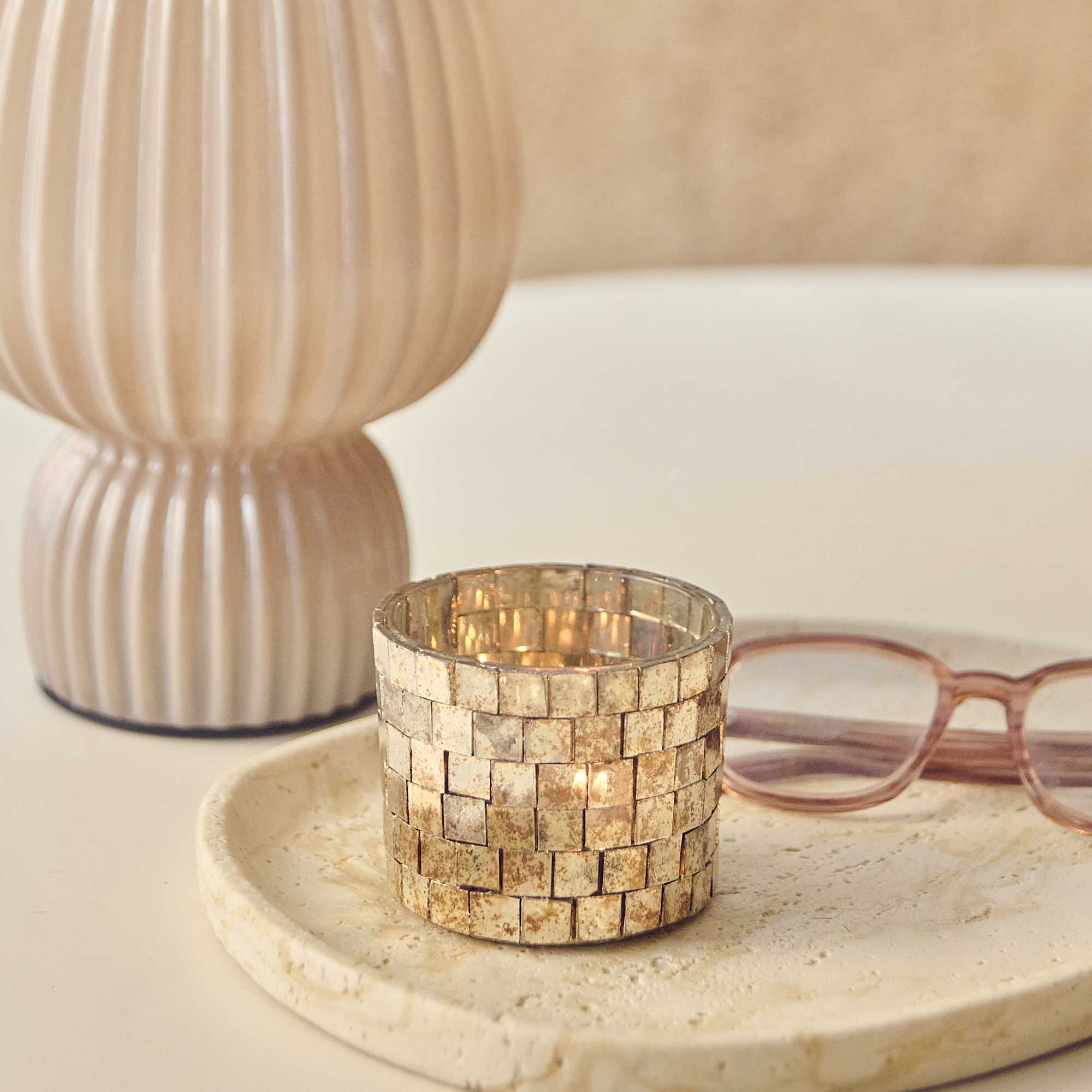 Covered with a beautiful mosaic of metallic tiles, our Herran Glass Candle Holders will cast the most magical glow in your home or even your garden.