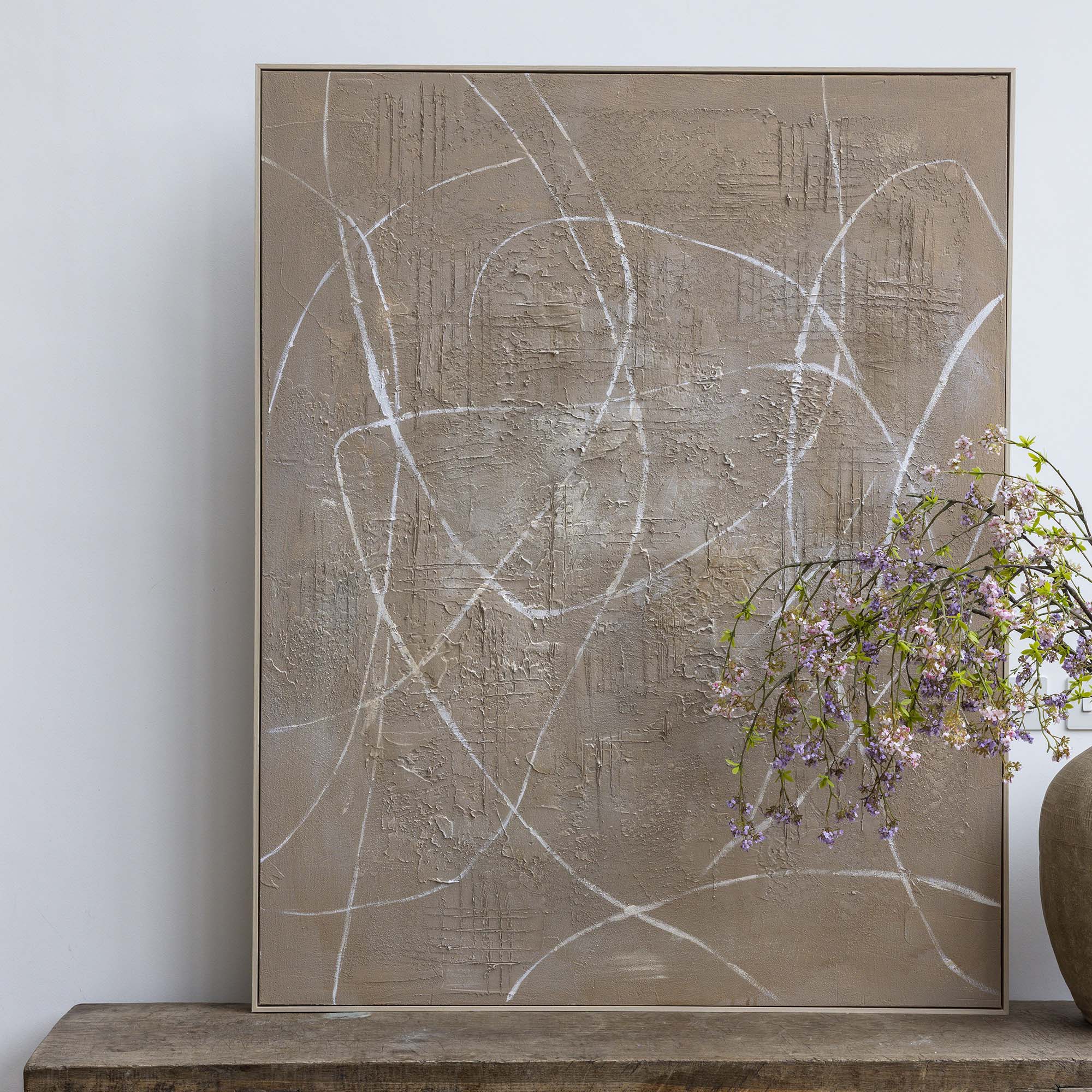 Set on a background of soothing sandy tones and warm beige hues, our Orenda Painting will add an elegant and refined feeling to your decor.