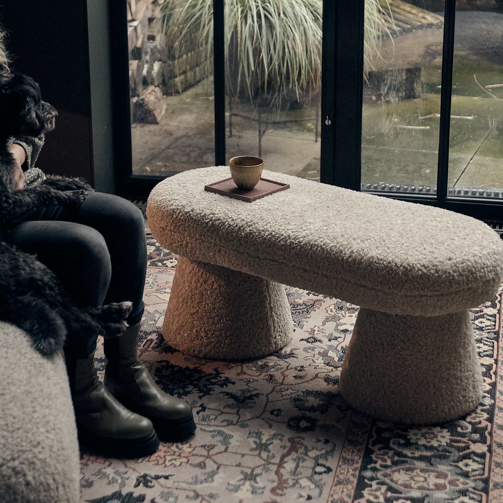 Featuring a curved, modern silhouette and finished in a plush, soft beige teddy fabric, our Tulip Bench is a stylish and inviting addition to any space.