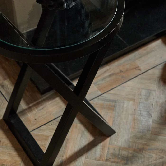 Crafted from a black stained wood and topped with round tempered glass, this side table is both visually stunning and oh so durable.